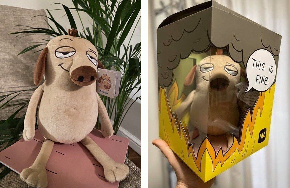 Обыграйте их в наборе стикеров, надписях на ручках и блокнотах. Так, ВКонтакте в 2020 дарили плюшевую собаку, в стиле мема This is Fine.