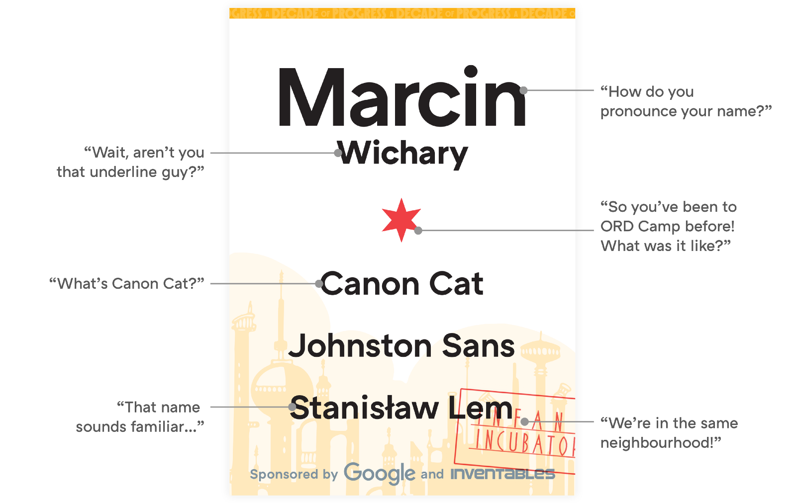 Спросите участников при регистрации, на какие три темы им интересно общаться, и добавьте эту информацию прямо на их бейдж. Так делают, например, организаторы мероприятия Google’s ORD Camp: крупный шрифт, видный издалека, звездочки для постоянных участников, город, откуда прибыл гость, а также три темы, которые носитель бейджа будет рад обсудить.