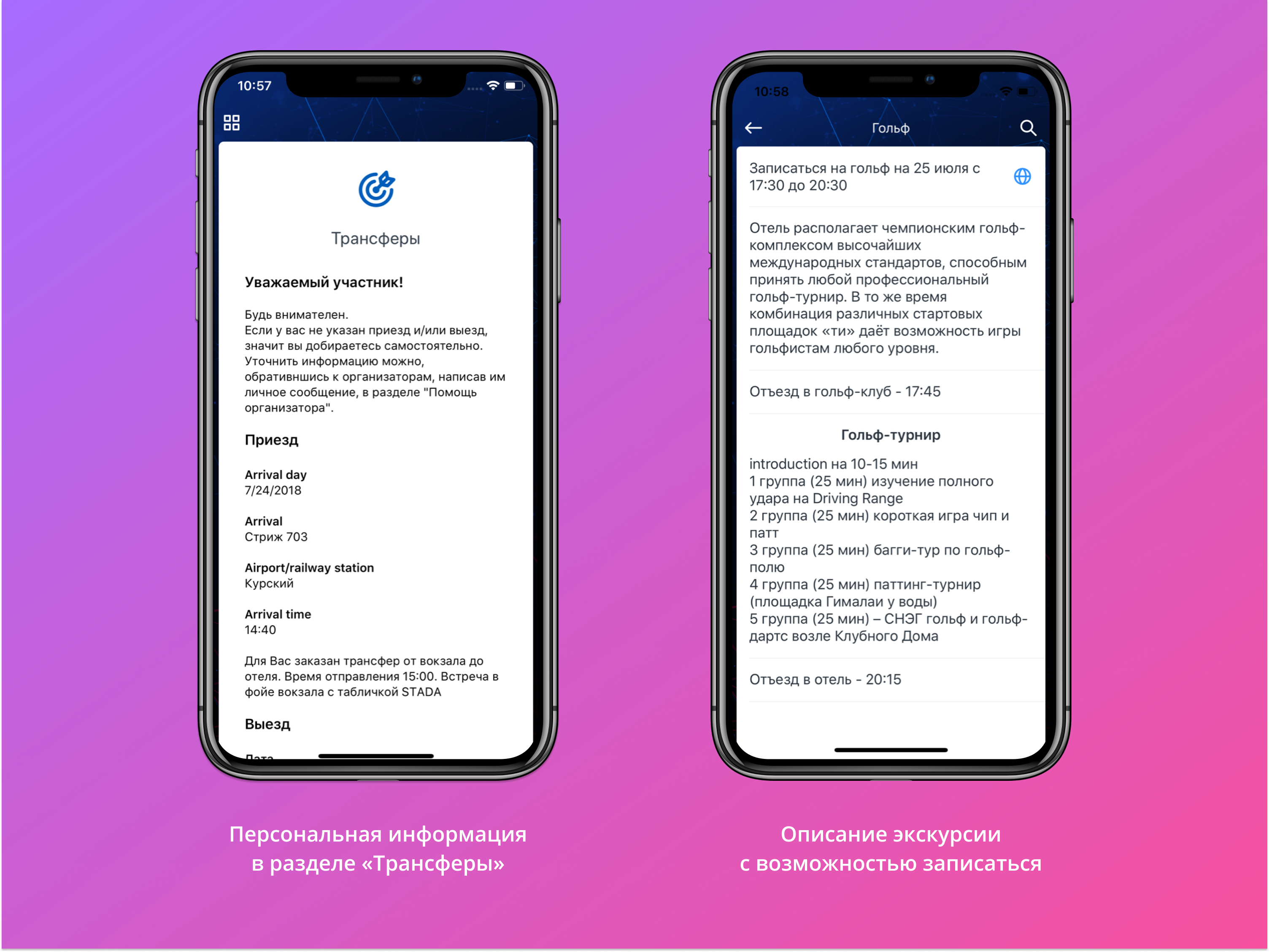 Чтобы облегчить себе жизнь и уменьшить количество вопросов, организаторы добавили в мобильное приложение конференции раздел «Трансферы». Раздел появлялся после того, как участник проходил авторизацию в приложении, и у каждого он был свой. В нём была собрана вся важная информация, касающаяся доставки до места проведения: номера рейсов, время отправления и прибытия, номер электронного билета, порядок организации встречи. На случай нестандартных ситуаций организаторы добавили раздел «Поддержка участников» с контактами ответственных сотрудников.