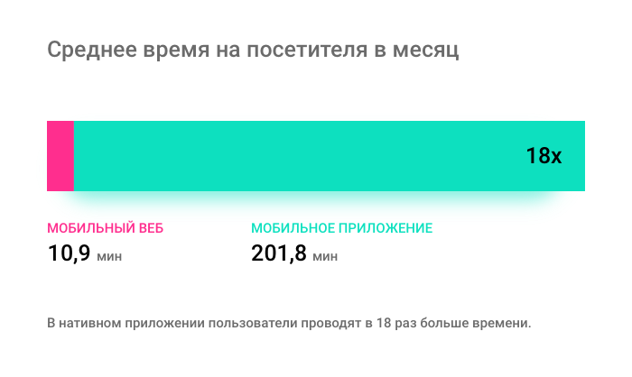 По данным агентства ComScore за 2015 год в мобильных приложениях взрослые пользователи провели в среднем в 18 раз больше времени, чем на мобильных веб-сайтах.