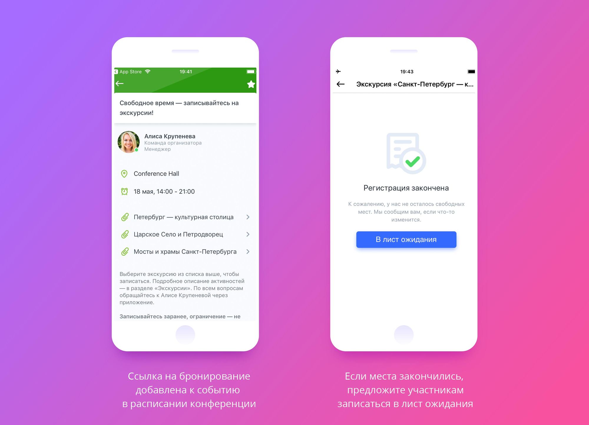 Как только участники ознакомятся с программой активностей или вариантами трансфера, они могут подать заявку на бронирование. При этом организатор не пропустит ни одного участника — а электронную почту будут приходить письма с уведомлениями об изменении списка участников.
