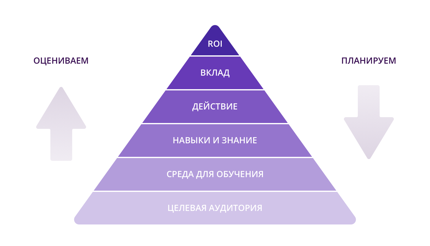 Визуально методология представлена в виде пирамиды. При планировании мероприятия мы идем сверху вниз, а эффект от мероприятия оцениваем, возвращаясь обратно снизу вверх.