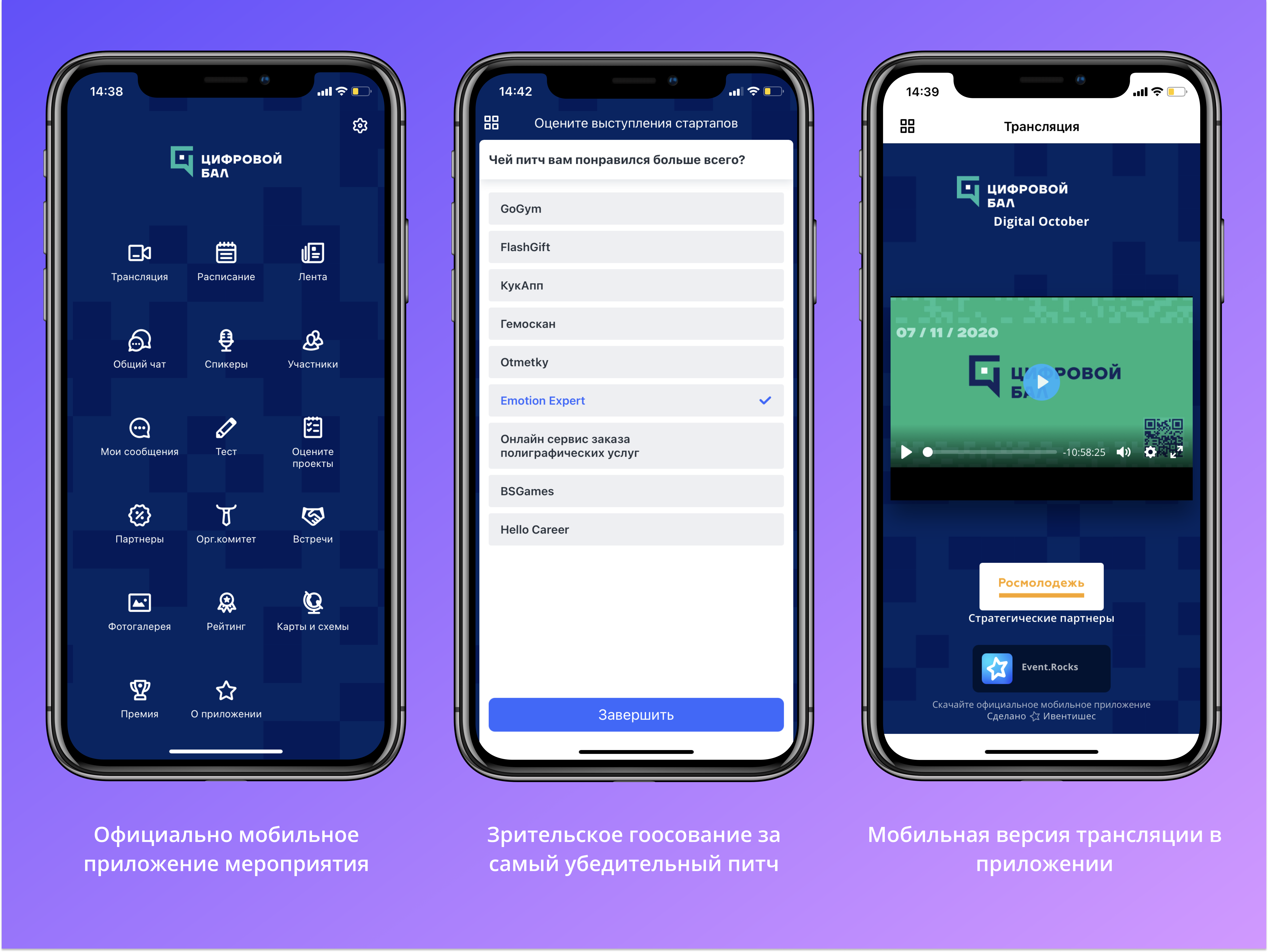 Для воплощения идеи мероприятия было важно, чтобы участники не просто смотрели эфир, а были максимально вовлечены. Для вовлечения мы использовали мобильное приложение на платформе Ивентишес. В нём участники могли участвовать в опросах знакомиться и общаться.