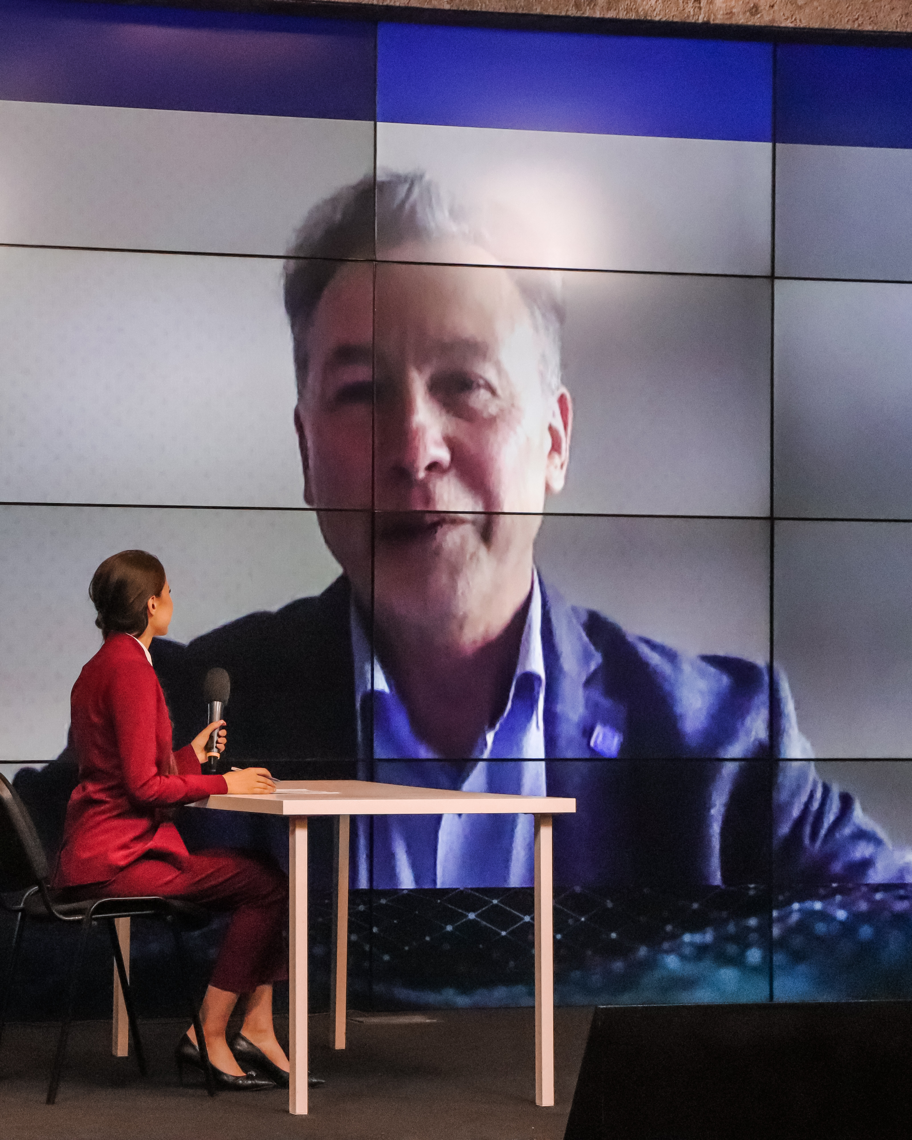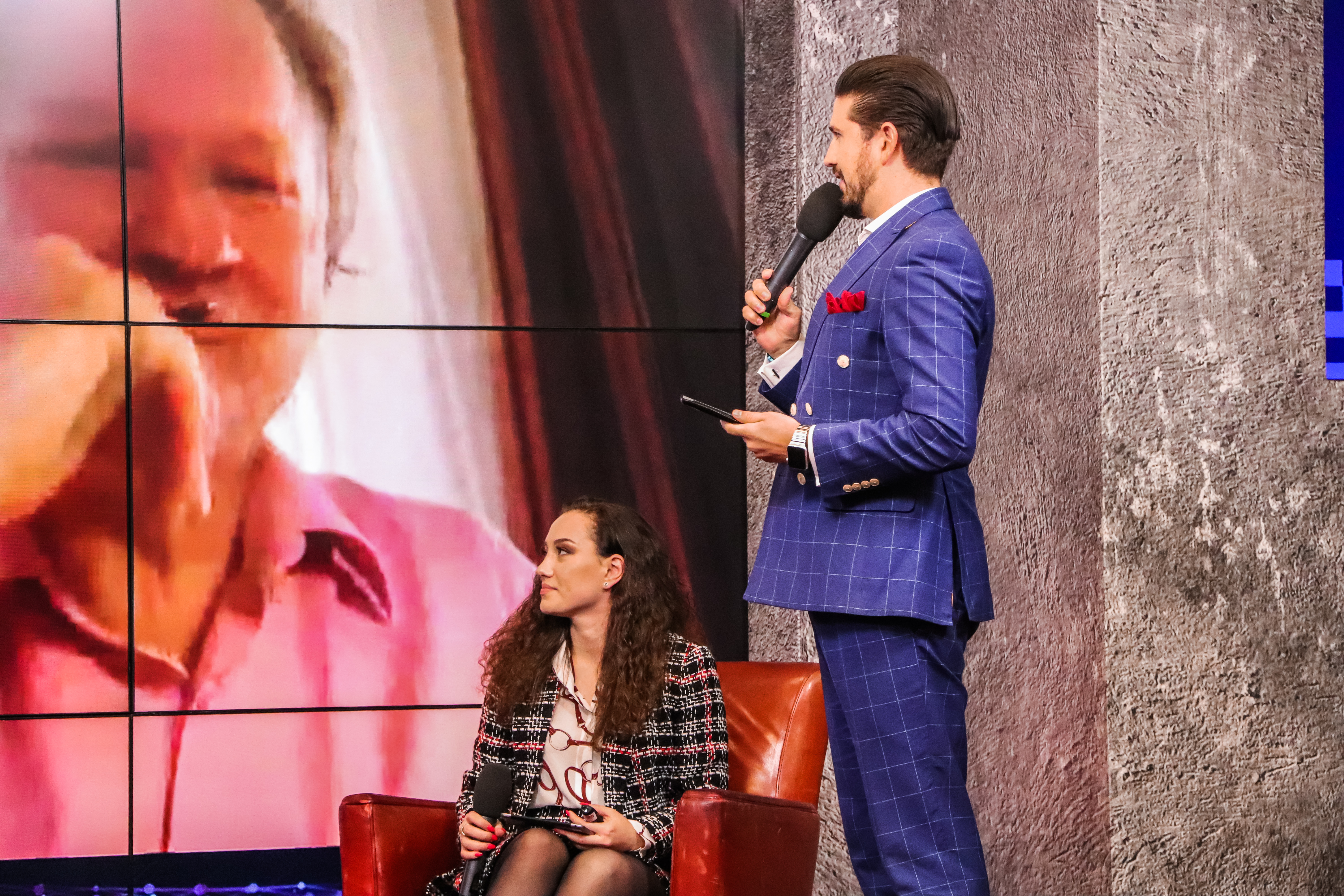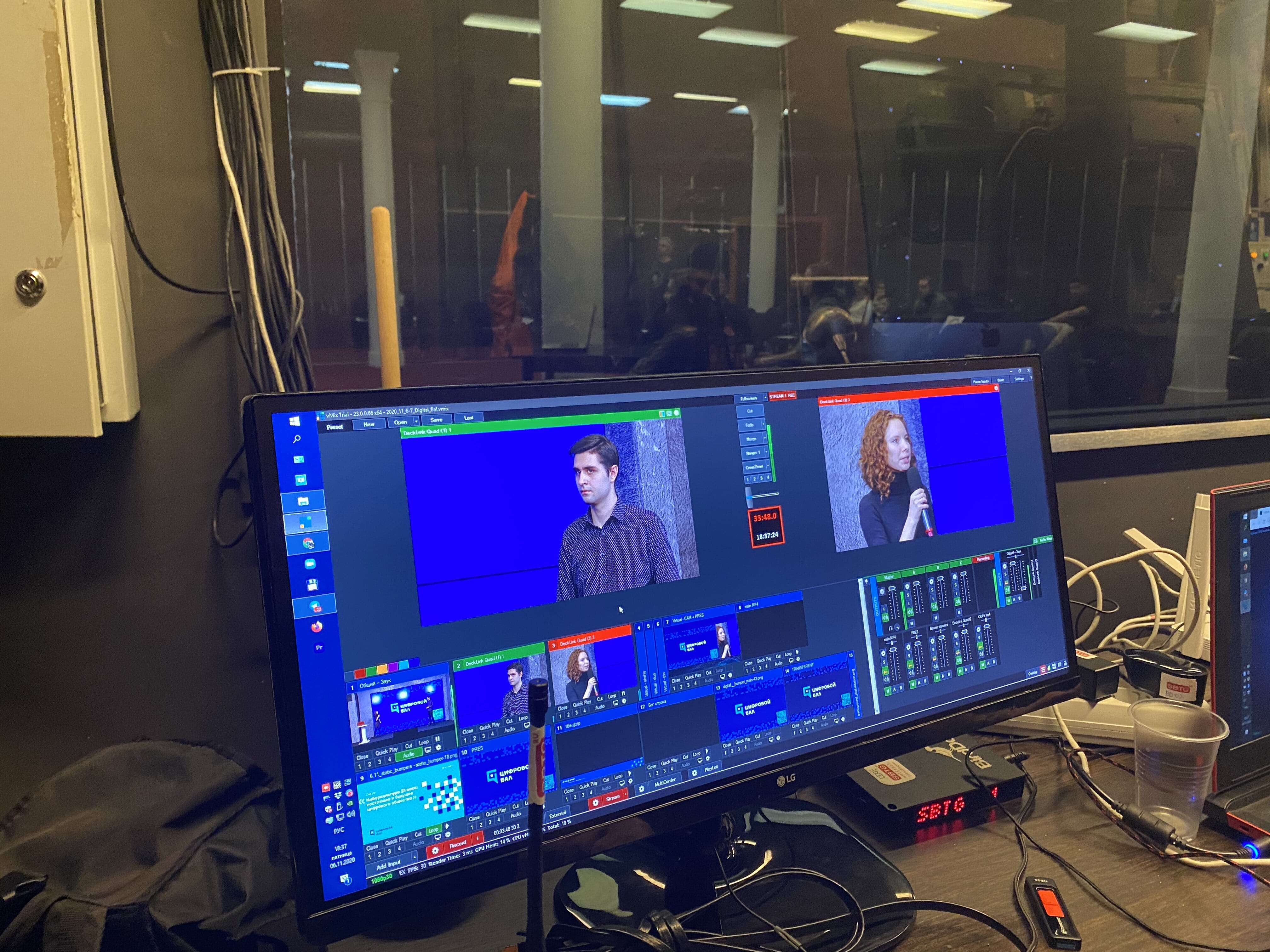 Очень важный вопрос: как мы соединяем эфир из студии и спикеров онлайн? В каждой секции «Цифрового бала» были как спикеры, которые вещали из студии на «Красном октябре», так и спикеры, которые выходили в эфир через ZOOM. На питч-сессии 6 из 9 стартапов презентовали свои проекты из студии, а 3 — подключались онлайн. Вот спикер появился на экране в студии, камера подъезжает к экрану и тут же мы должны вывести в эфир сигнал трансляции напрямую, без съемок экрана.