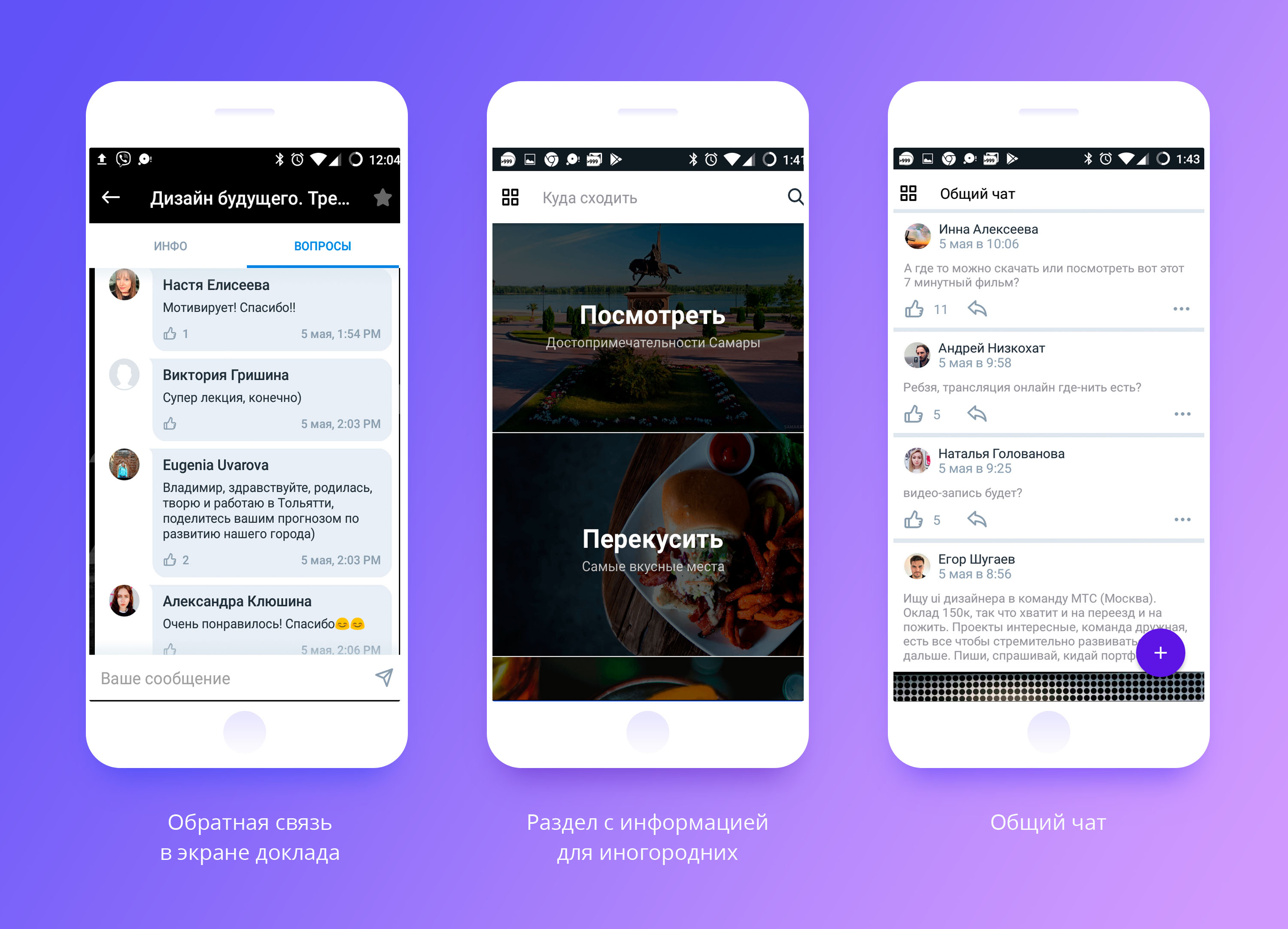 На конференцию съехались дизайнеры из почти 70 (!) городов страны. Специально для иногородних гостей в приложении был добавлен раздел «Куда сходить» с информацией о кафе, ресторанах и барах поблизости от места проведения конференции. А чтобы участникам было проще найти единомышленников для похода по заведениям, сделали общий чат.