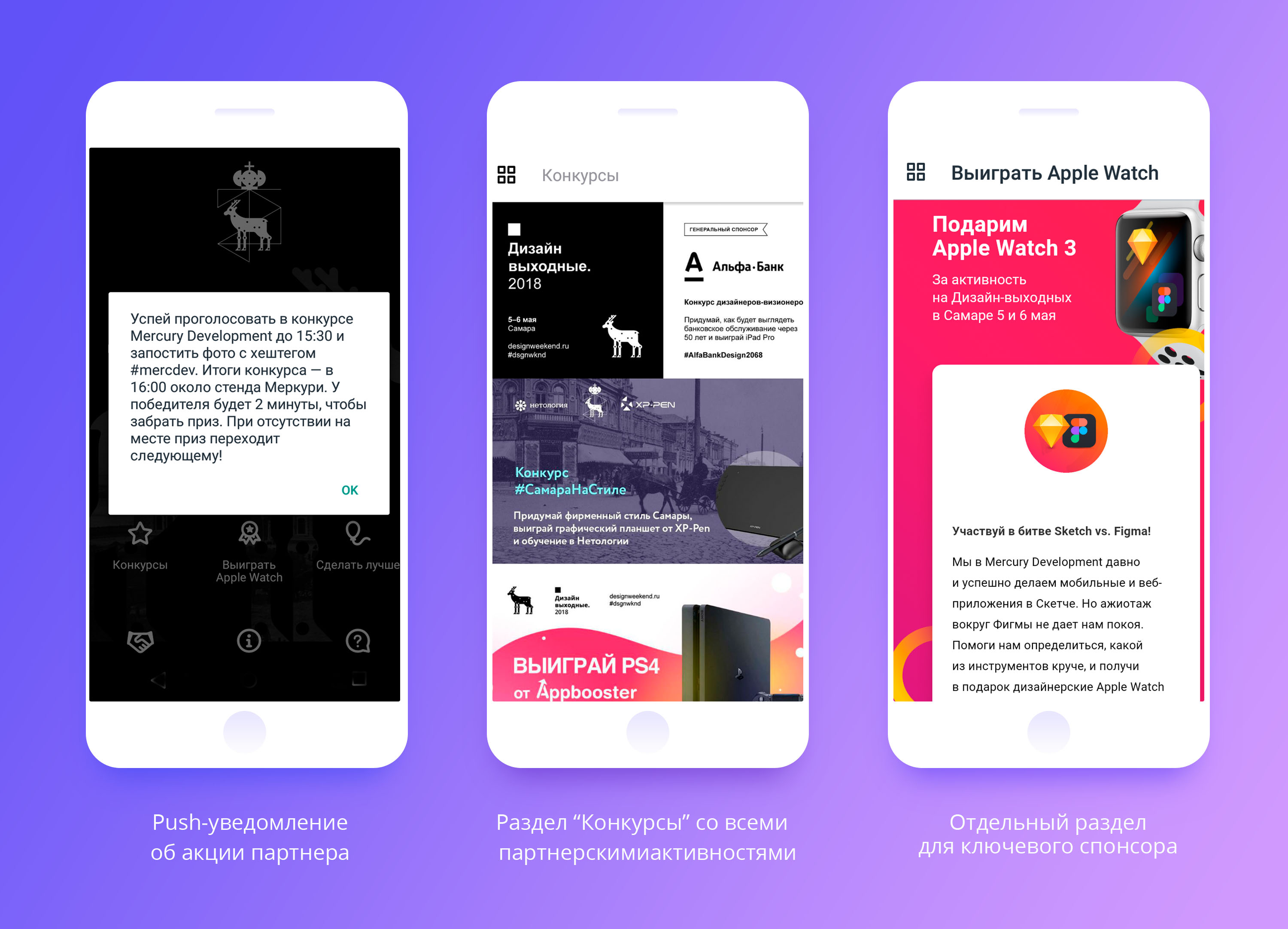 Еще одна задача, которую выполняло приложение «Дизайн-выходных» —массовое информирование. Участники получали моментальные уведомления (Push-уведомления) на смартфоны об изменениях в расписании, о розыгрыше призов на площадке спонсора и приглашения на открытие и подведение итогов.
