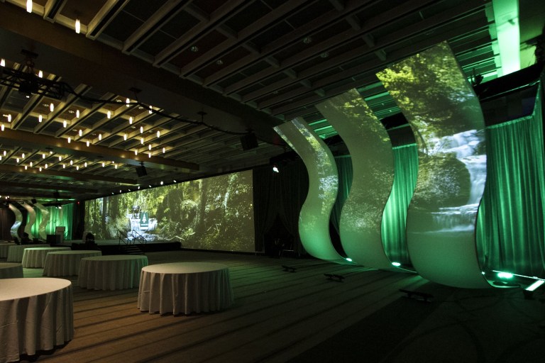 Попробуйте отказаться от баннеров и ПВХ-пленки в оформлении площадки и сцены. Вместо них можно использовать, например, проекторы. Проекционные системы используют энергоэффективные технологии и позволяют создать совершенно фантастическое оформление мероприятия.