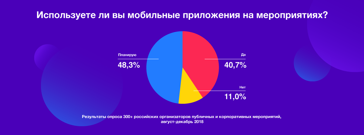 В период с августа по декабрь 2018 года мы опросили участников двенадцати профессиональных конференций для организаторов публичных и корпоративных мероприятий. Нас интересовало, используют ли они мобильные приложения и сервисы на своих ивентах и планируют ли использовать в будущем. И вот что нам удалось узнать.