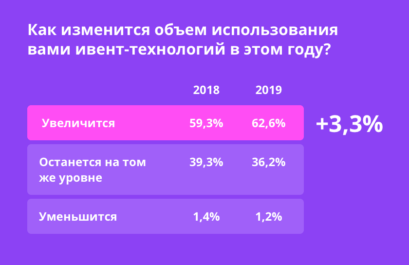 Что касается освоения новых технологий, 62% опрошенных ивент-профессионалов заявили, что обязательно будут использовать больше ивент-технологий в этом году. Если сравнить этот показатель с 2018 годом, уверенность выросла на 3%.