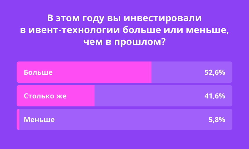 Согласно исследованию 52% ивент-профи планируют увеличить в своем бюджете долю расходов на то, чтобы сделать мероприятие более технологичным.