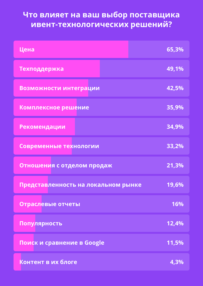 В то время как 45% организаторов мероприятий используют и комплексные, и вертикальные решения, доля тех, кто использует «всё в одном», выросла на 27% по сравнению с прошлым годом.