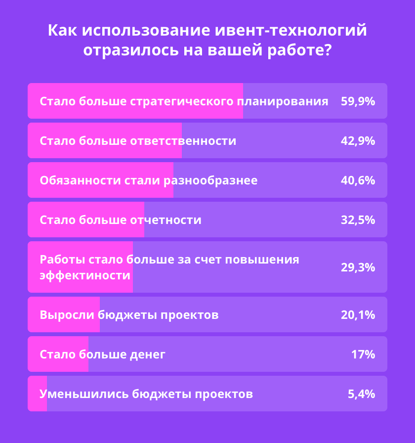 Это высказывание подтверждается тем, как организаторы видят воздействие ивент-технологий на свою работу. Вне зависимости от бюджета, которым они располагают, организаторы мероприятий едины во мнении, что технологии дали им больше ответственности или заставили мыслить и поступать более стратегически.