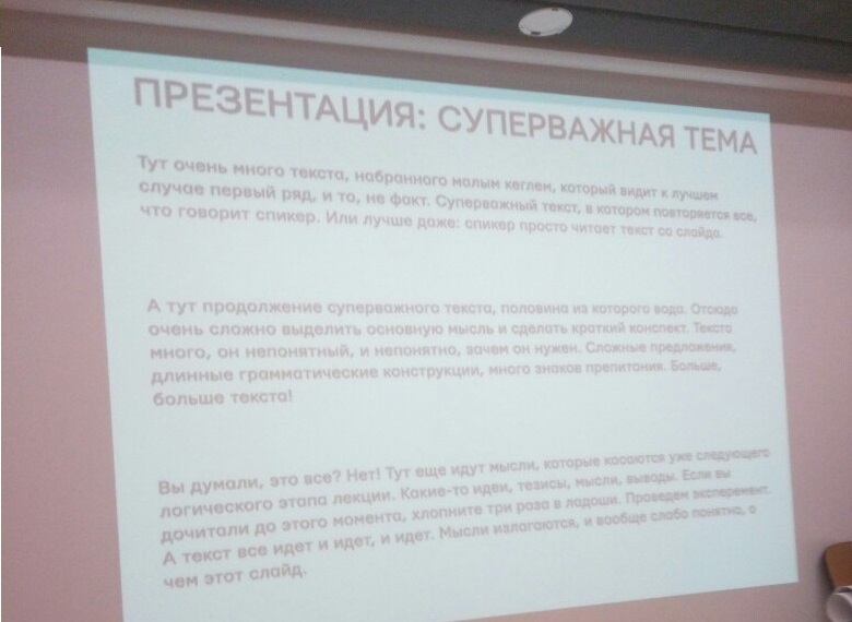 «Поехавшие» шрифты, длинные «простыни» в тексте и плохо подобранная цветовая гамма в сочетании с тусклым проектором — лучший способ показать участникам, как мало вы цените их внимание и время.