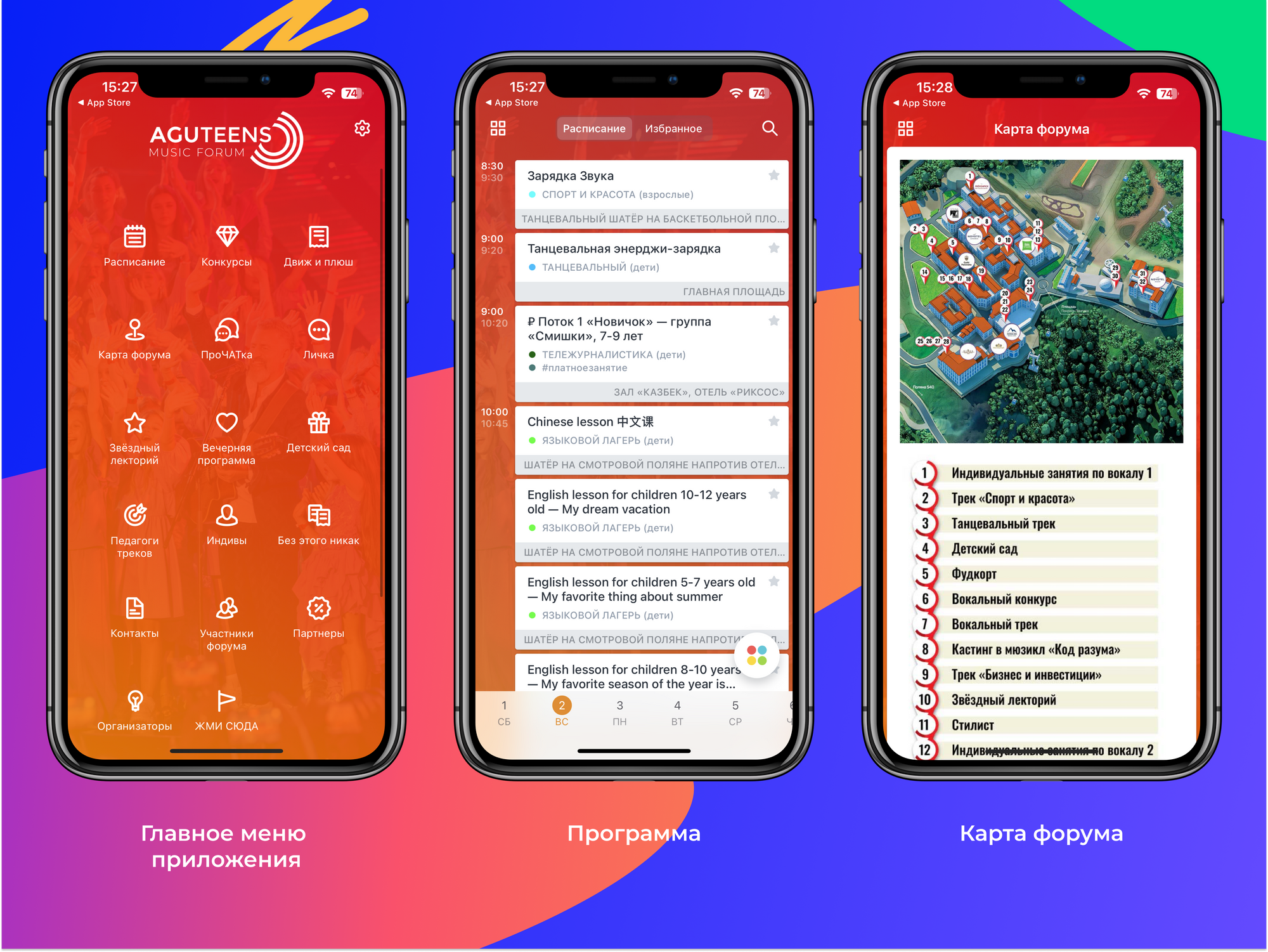Основные направления форума для детей: вокал, хореография, актёрское мастерство, а также сонграйтинг, тележурналистика, профориентация и финансовая грамотность, языковой лагерь, скорочтение, ментальная арифметика, спорт.