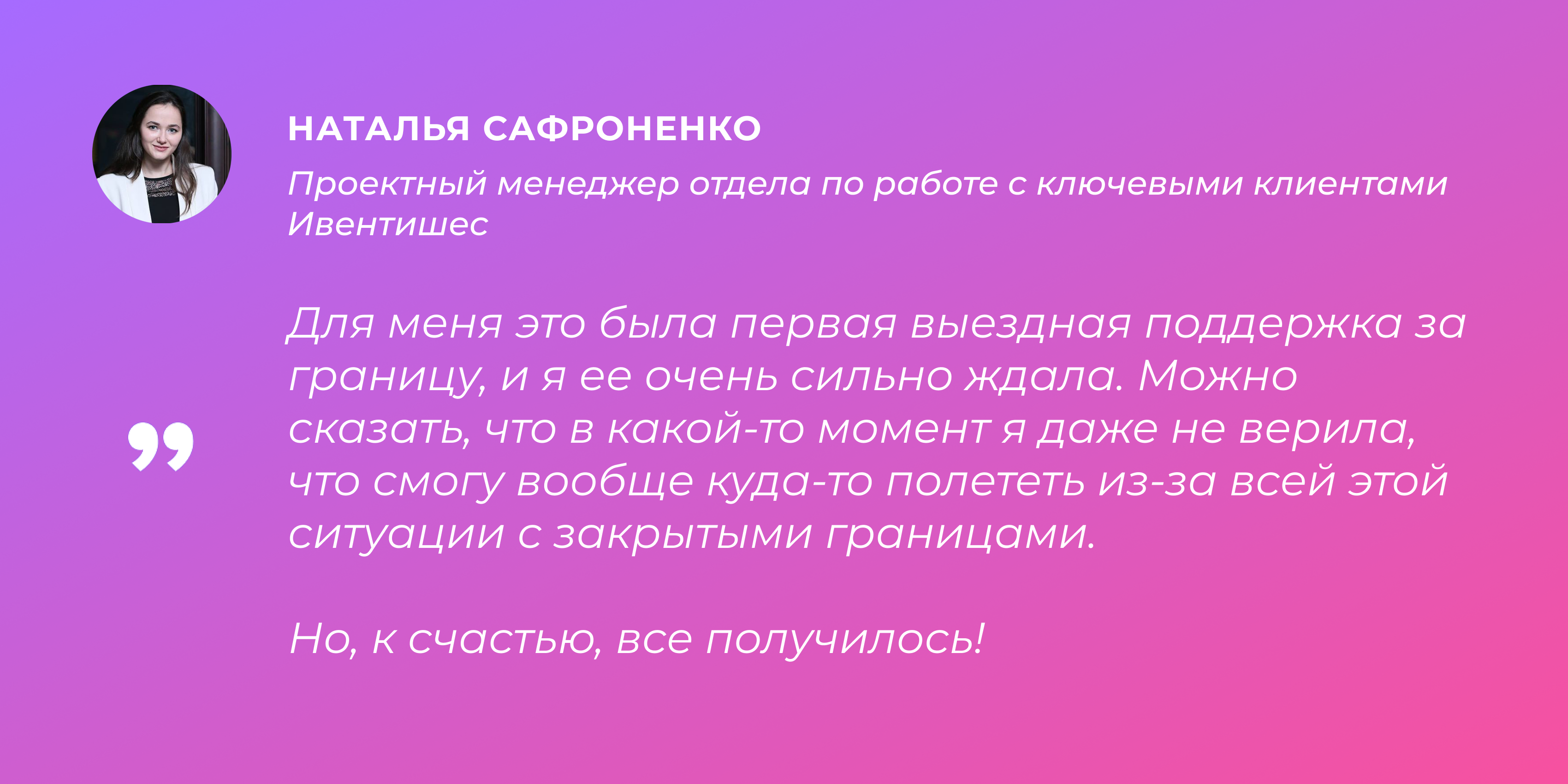 Особенно приятно знать, что участники пользуются нашим решением до сих пор, спустя два месяца после мероприятия», – Наталья Сафроненко, проектный менеджер отдела по работе с ключевыми клиентами Ивентишес.