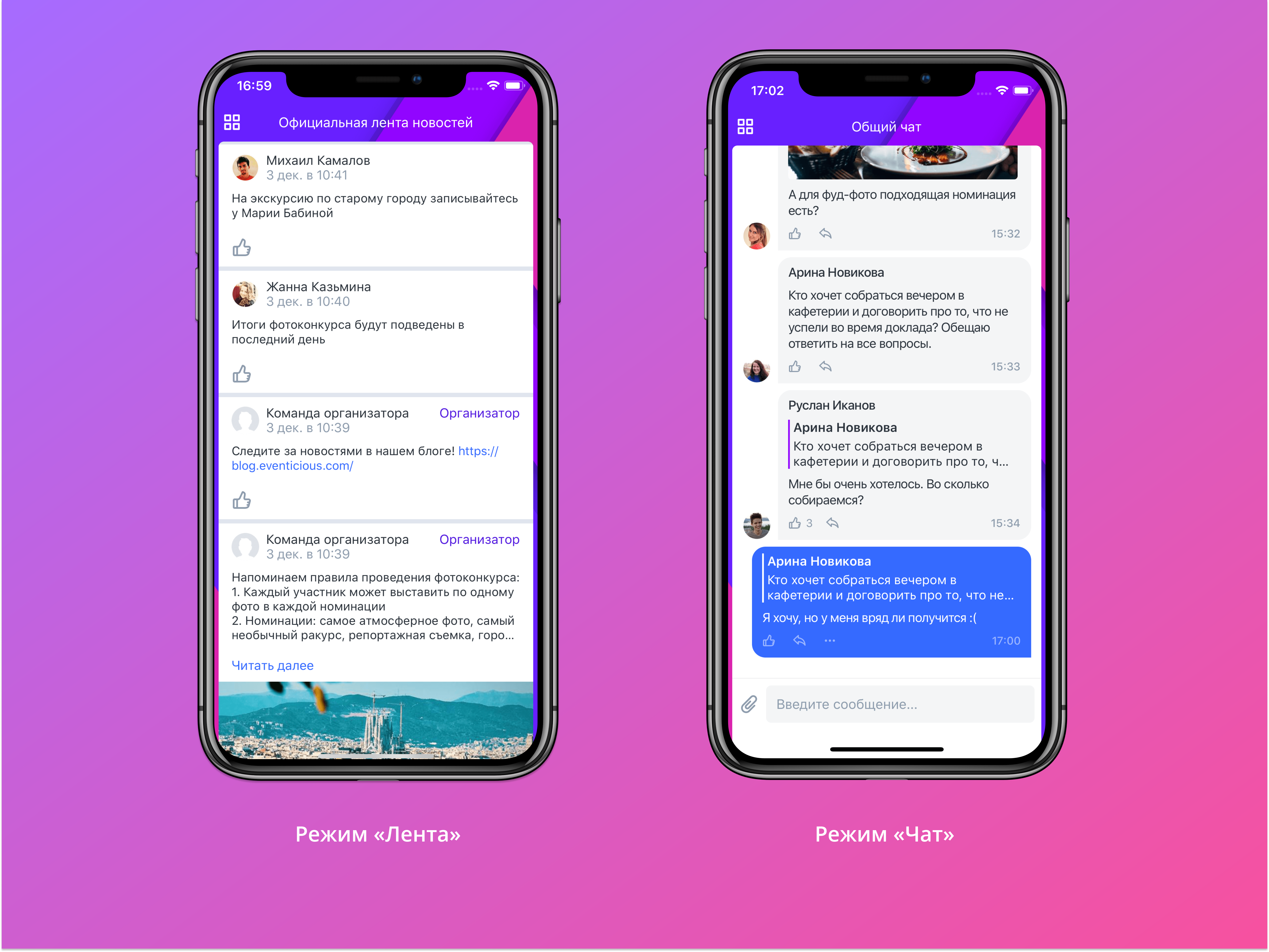Организаторы сами решают какой режим — лента или чат — выбрать для коммуникационного раздела приложения в зависимости от задач и аудитории.