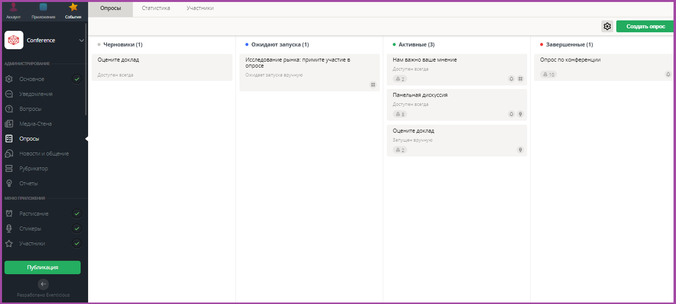 На дашборде управления опросами в панели администратора теперь видно, какие опросы находятся в какой стадии. Какие из них уже доступны участникам, а какие пока ждут своей очереди. Настройка параметров опросов стала более удобной и интуитивно понятной.