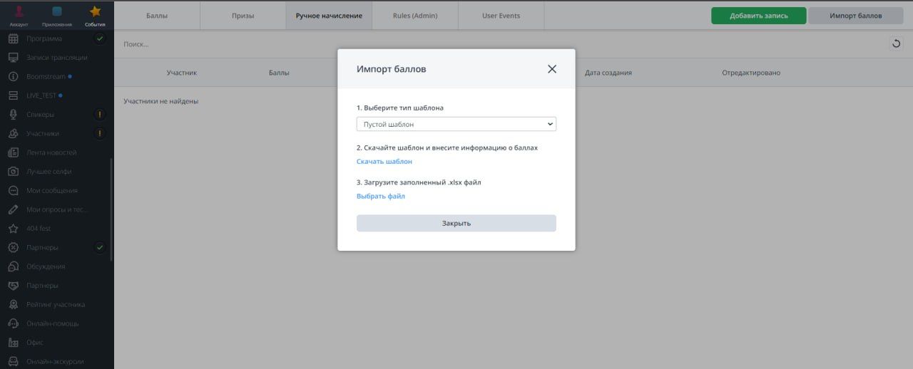 Теперь есть возможность создавать шаблоны на группы участников и начислять баллы сразу всем пользователям из списка. Такую возможность можно реализовать для любого количества участников, даже для всех посетителей мероприятия.
