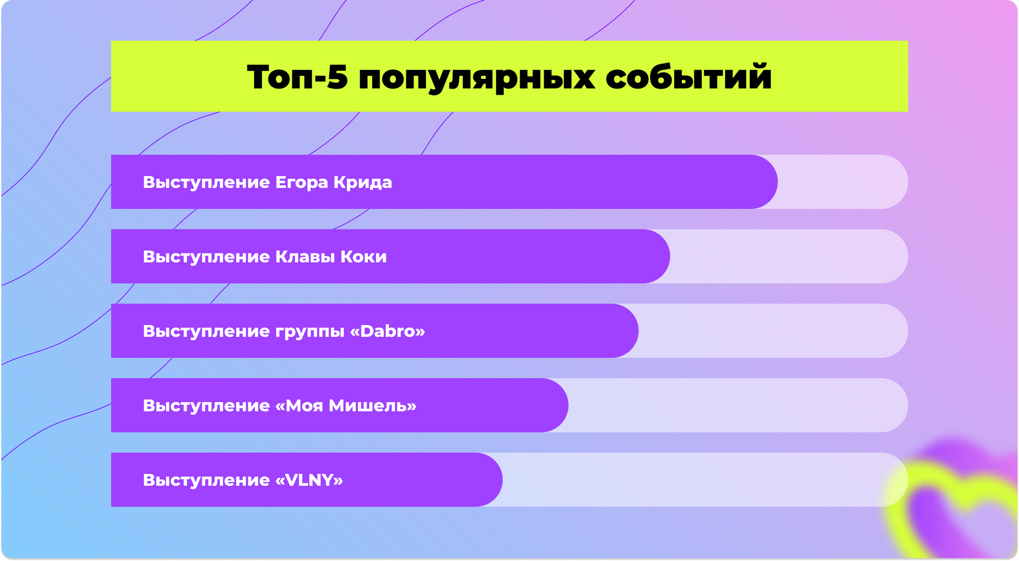 Самыми популярными и обсуждаемыми событиями фестивальной программы стали концертные выступления известных артистов – Егора Крида, Клавы Коки, группы «Dabro», «Моя Мишель» и «VLNY».