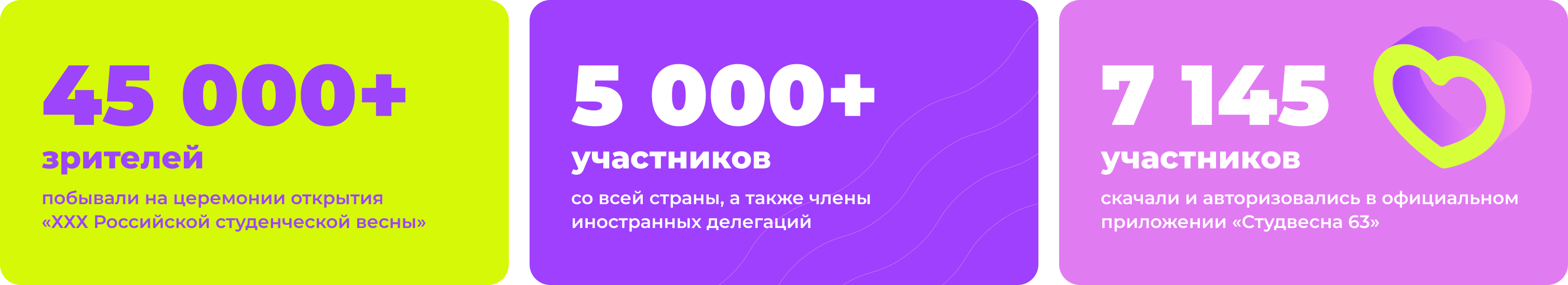 Участниками и гостями фестиваля стали свыше 5 000 творческих студентов из 85 регионов страны и ближнего зарубежья, а зрителей только на церемонии открытия было более 45 000+ человек.
