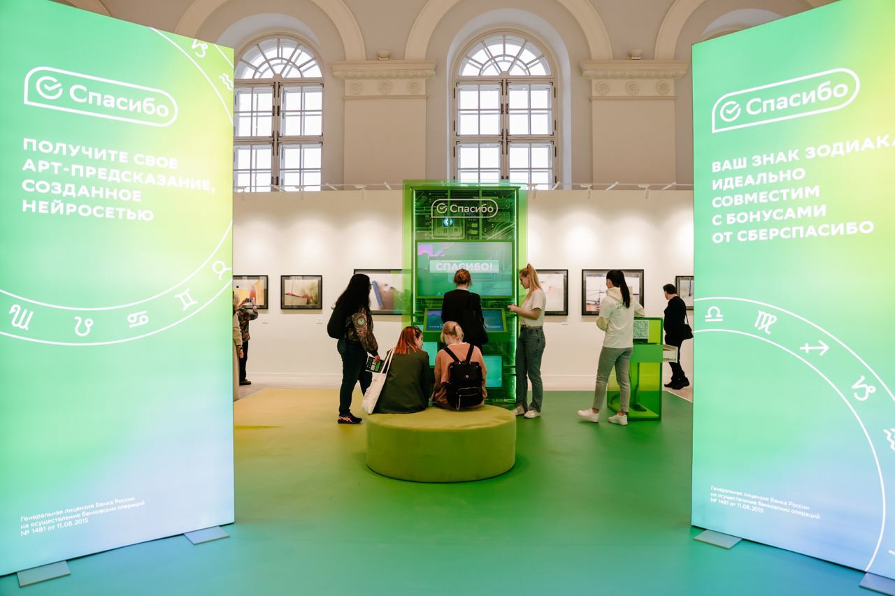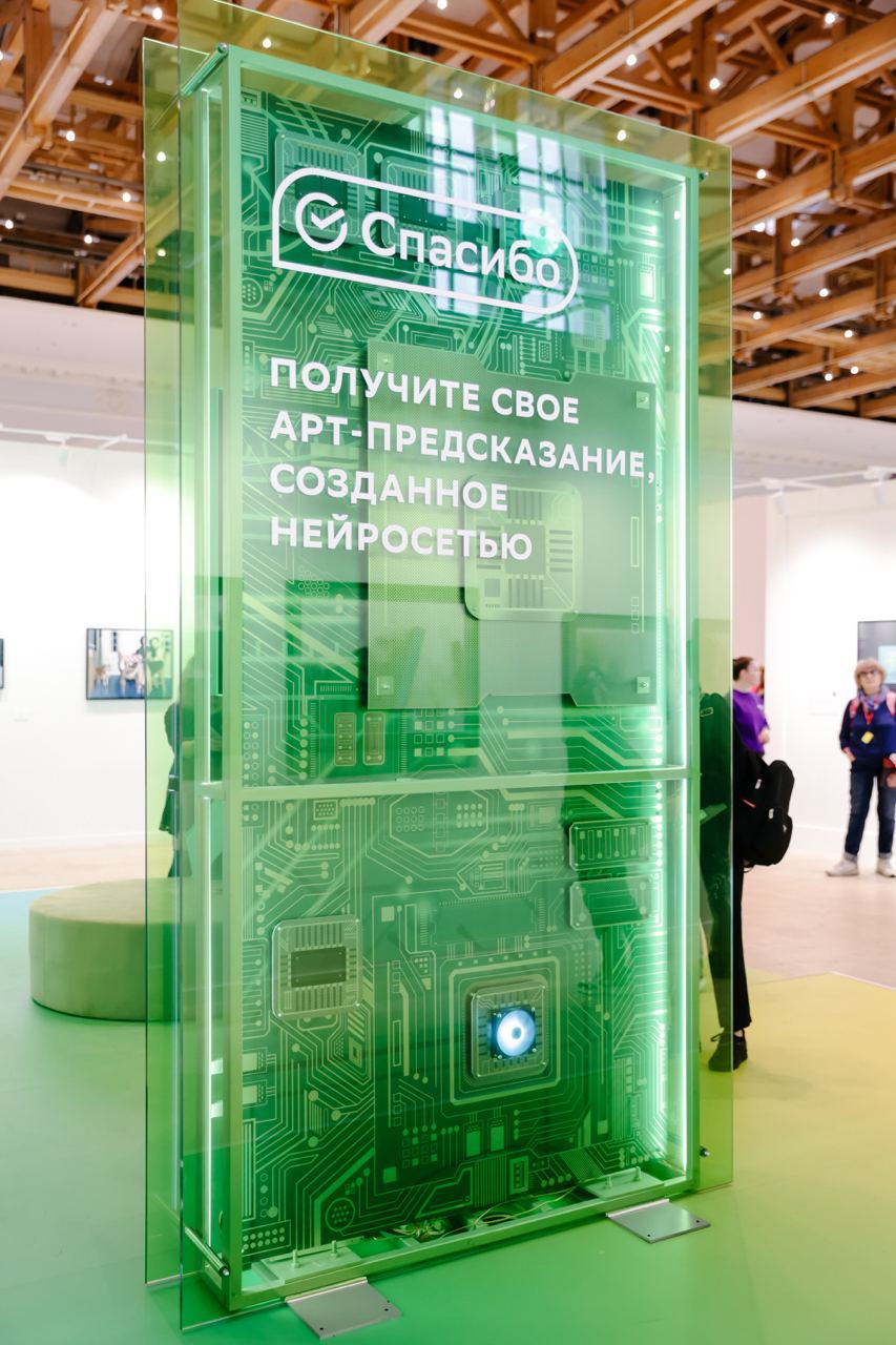 Ключевым объектом стенда была стелла с огромной бутафорской микросхемой внутри. На экране рядом нужно было ввести свое имя и знак зодиака. После этого гость получал персональный арт-гороскоп, созданный нейросетью.