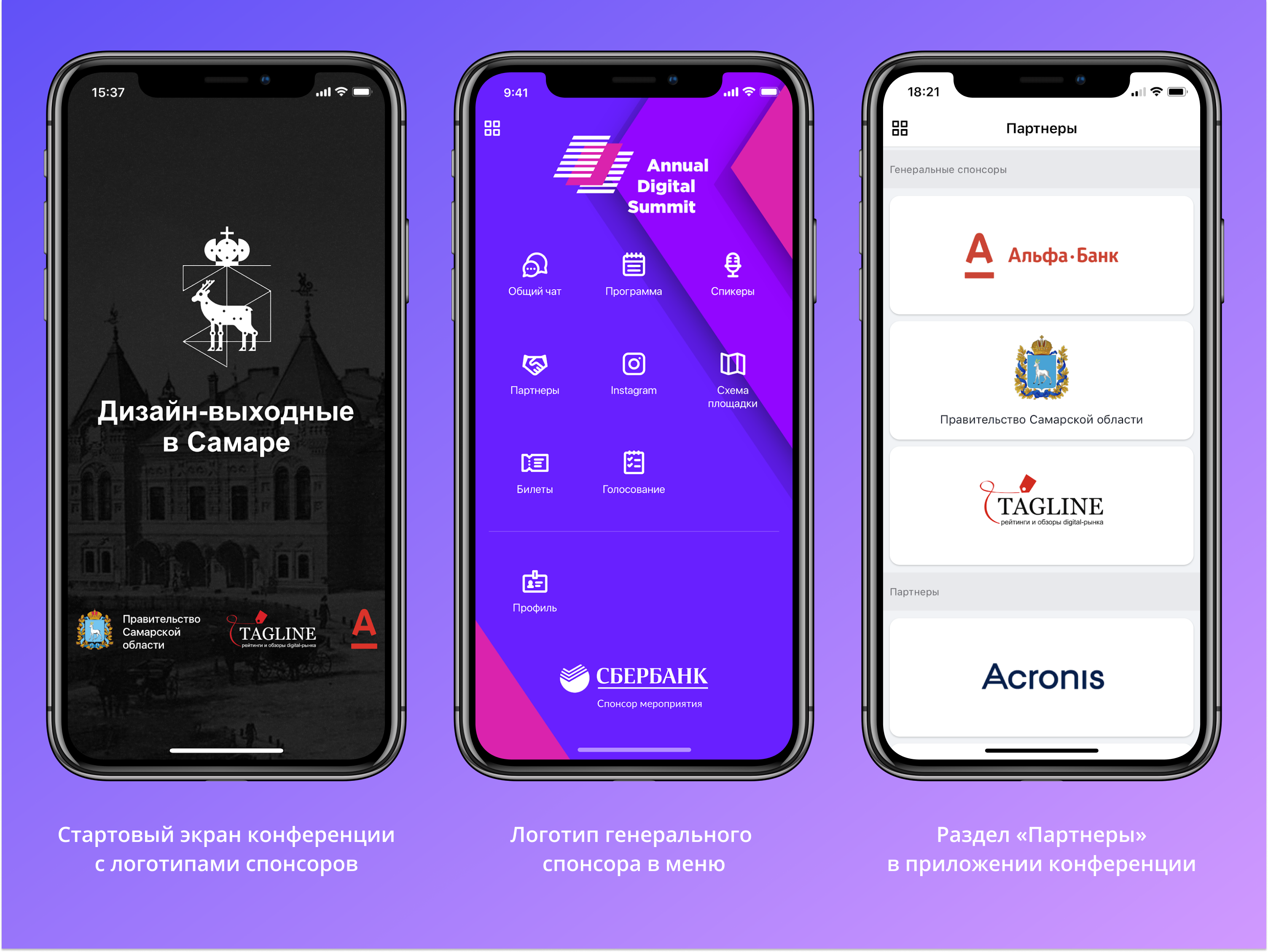 Меню и расписание — два самых часто открываемых экрана в мобильном приложении. Логотипы спонсоров будут бросаться в глаза каждый раз, когда участник открывает приложение или ищет интересующий доклад.