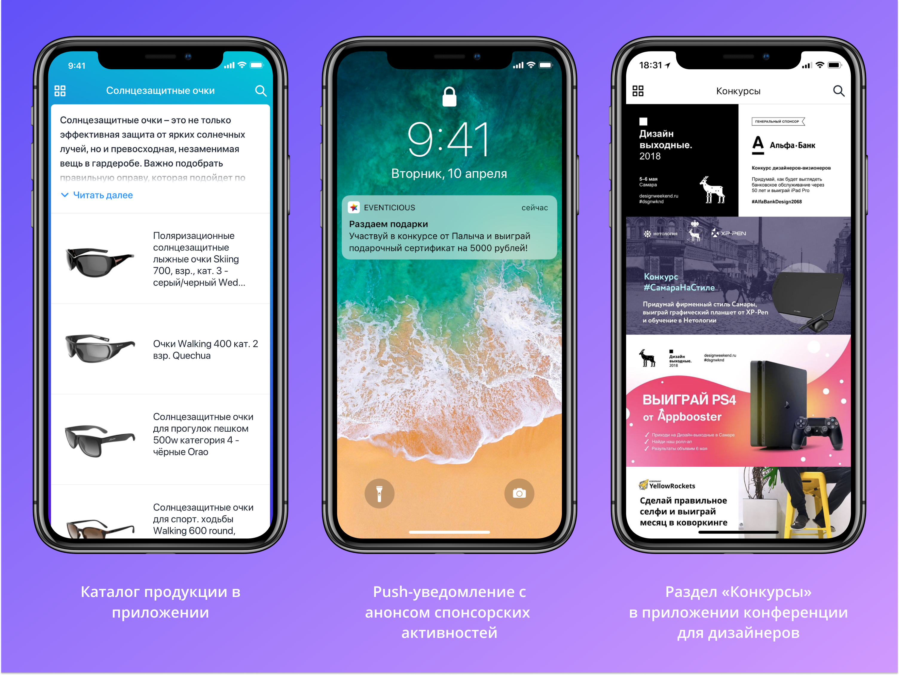Бриллиант нашей коллекции новых способов рекламы спонсоров на ивенте. Приложение позволяет встраивать различные интерактивные форматы продвижения спонсоров — анкеты, викторины, мини-игры. В примере ниже организаторы «Дизайн-выходных» добавили в приложение отдельный раздел «Конкурсы», где собрали все спонсорские активности на конференции для дизайнеров. Каждый баннер открывает отдельную страницу с подробным описанием условий акции.