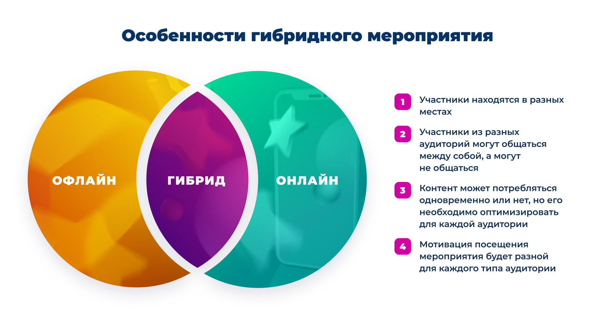 Чтобы понять эти изменения, давайте начнем с признания того, что существует много точек зрения, какое мероприятие можно назвать гибридным. Однако, на самом базовом уровне, большинство гибридных мероприятий содержат следующие элементы:
