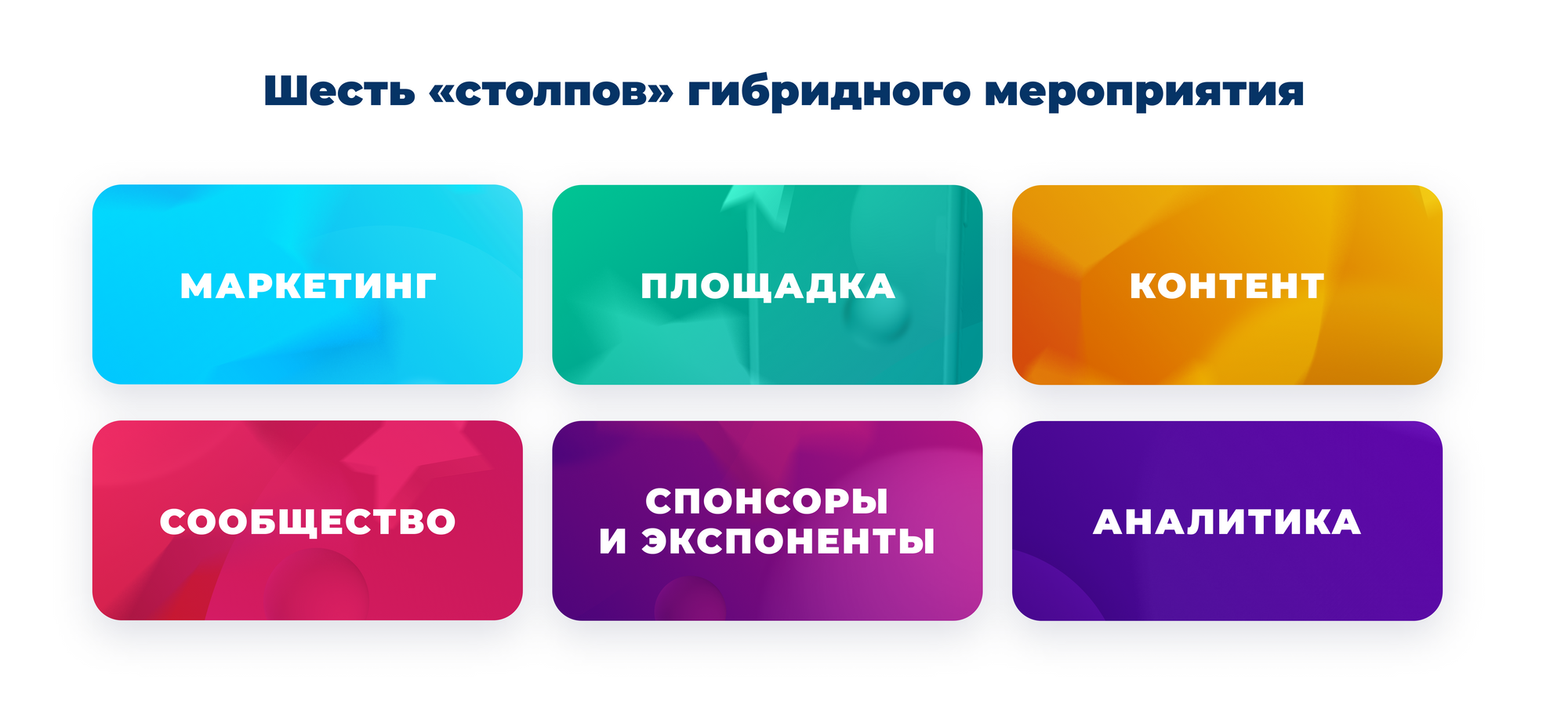 Но с какой стороны лучше подойти к планированию гибридного мероприятия? Для ответа на этот вопрос существуют шесть ключевых элементов гибридной стратегии. Вы можете использовать их как основу для планирования мероприятий в целом.