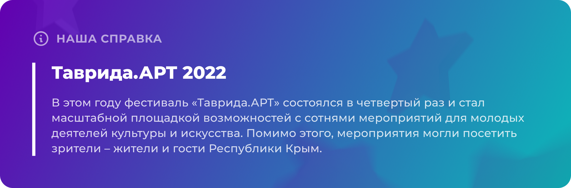 «Таврида.АРТ» — платформа возможностей для молодых деятелей креативных индустрий, культуры и искусства. Свою историю «Таврида» начала в 2015 году, когда получила статус Всероссийского молодежного образовательного форума. В 2019 году «Таврида» выросла в арт-кластер. Он объединяет образовательные заезды, фестиваль, кастинг-платформу, грантовый конкурс, федеральную сеть арт-резиденций, строящийся Университет креативных индустрий и другие проекты. Входит в федеральный проект «Молодежь России» национального проекта «Образование» и реализуется при поддержке Федерального агентства по делам молодежи (Росмолодёжь).
