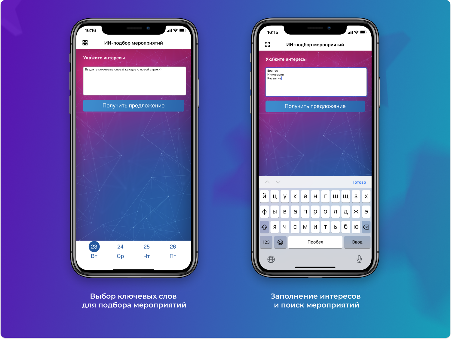 В отдельный раздел ивент-приложения мы интегрировали сервис, который на основе ключевых слов, введенных пользователем, подбирает подходящие пункты программы, анализируя описание мероприятий. К следующему форуму мы планируем развить этот сервис, чтобы сделать его более полезным и удобным для участников.