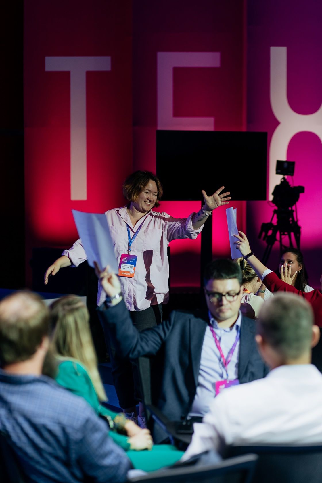В нужный момент участники получили push-уведомление с предложением пройти опрос в приложении, а результаты выводились в прямом эфире на экранах пленарного заседания. Хочу сказать, что это — очень удобный сервис для любого мероприятия, когда хочется добавить какого-то интерактива с участниками. Хороший способ пробудить и встряхнуть аудиторию во время длительных сессий, повысить активность и вовлечение участников.