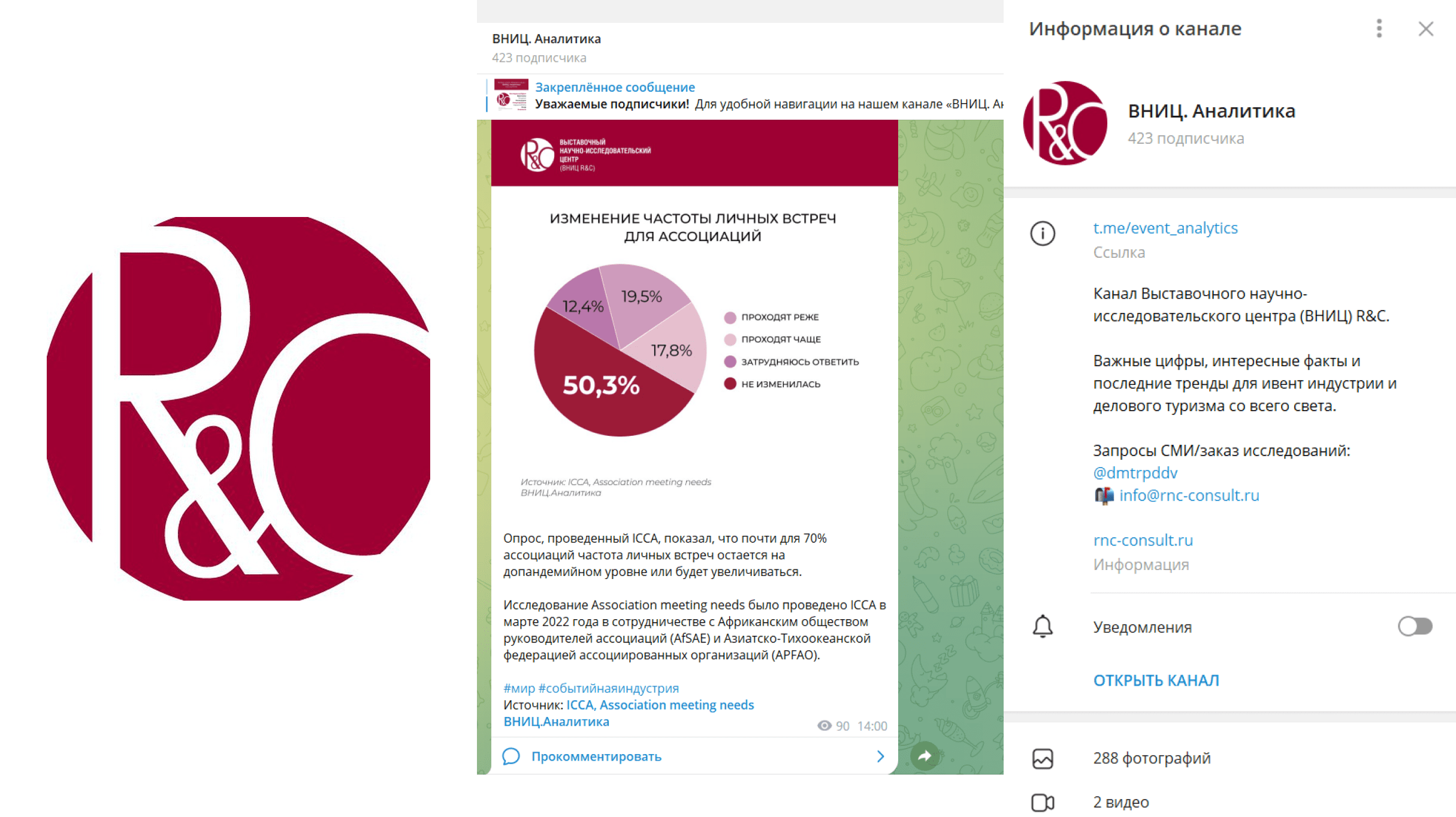 Канал Выставочного научно-исследовательского центра (ВНИЦ) R&C, где публикуются цифры, факты и тренды в нишах ивент-индустрии и делового туризма.