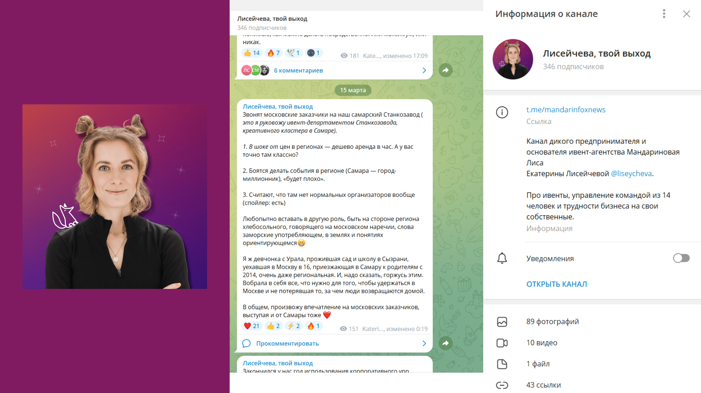 Тут основательница ивент-агентства «Мандариновая Лиса» Екатерина Лисейчева пишет личные истории про ивенты, управление командой и трудности бизнеса.