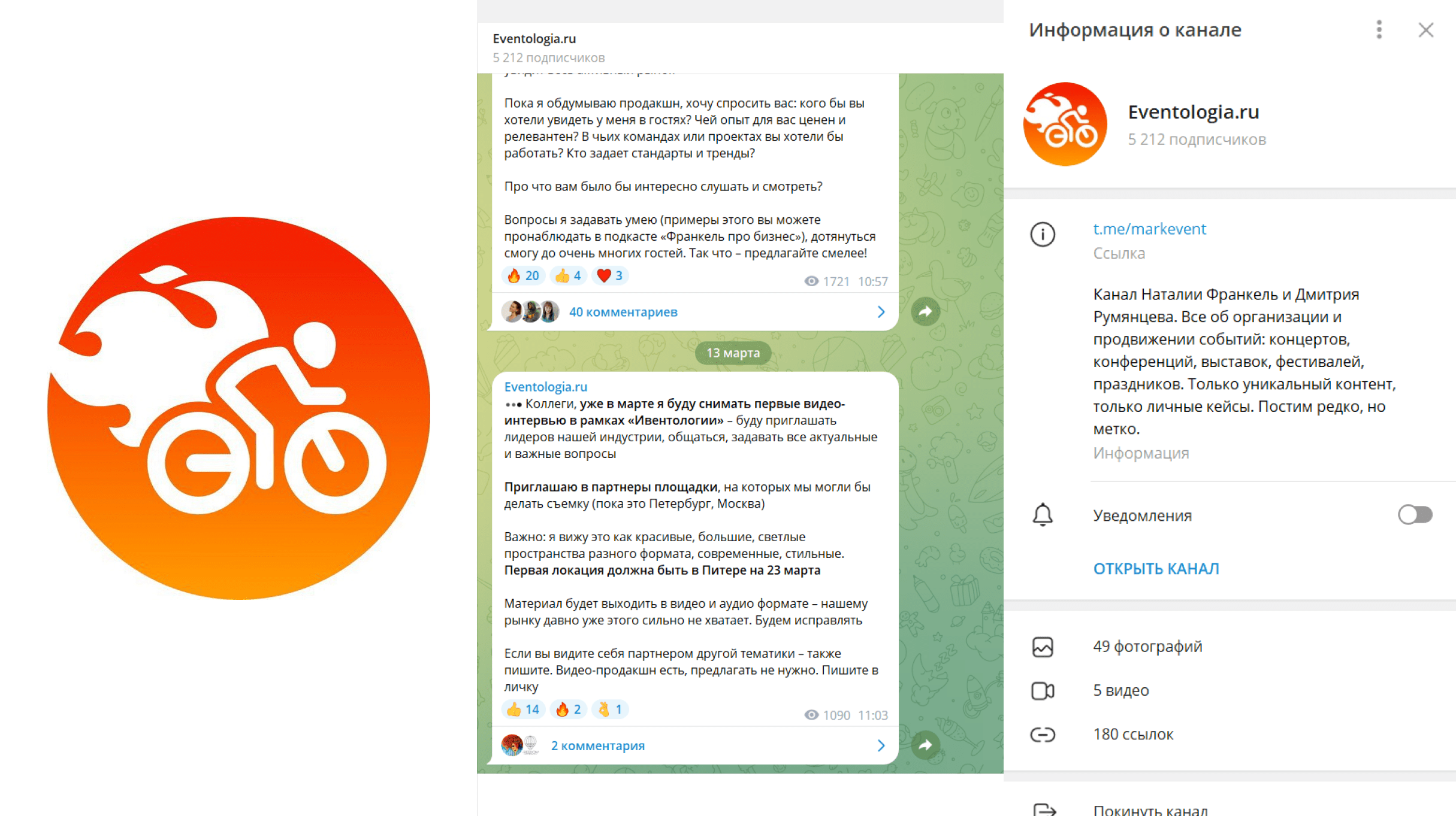 Канал Наталии Франкель и Дмитрия Румянцева. Авторский контент об организации и продвижении событий: концертов, конференций, выставок, фестивалей. Практически применимый контент, который должен быть под рукой у любого организатора.