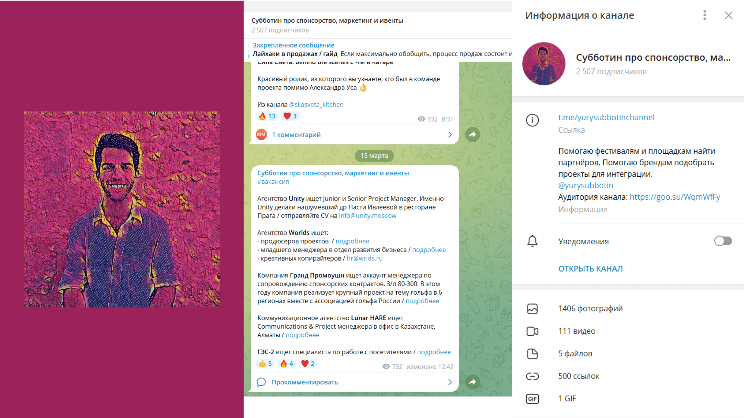 В своём блоге Юрий Субботин помогает фестивалям и площадкам найти партнёров, а брендам — подобрать проекты для интеграции.